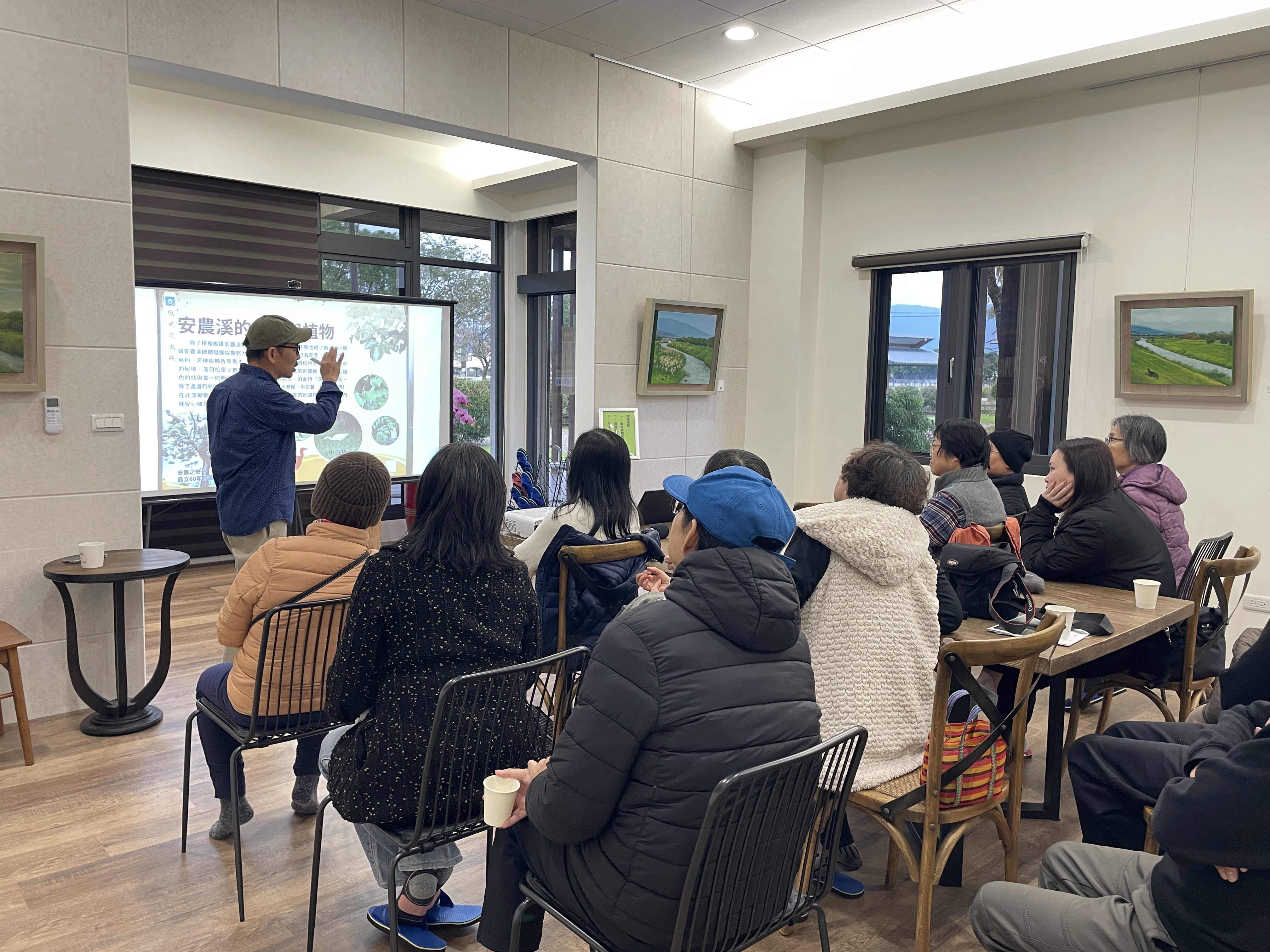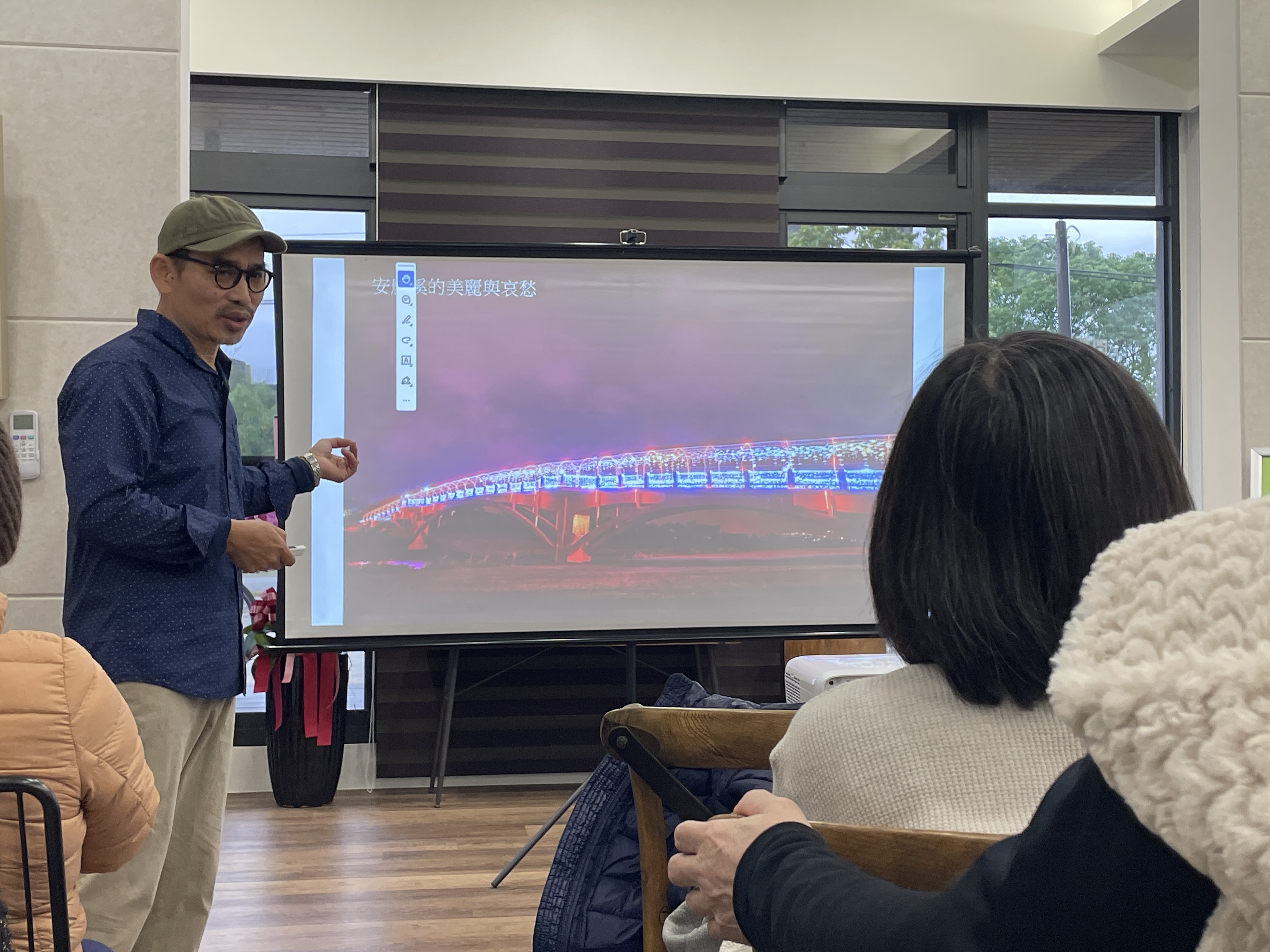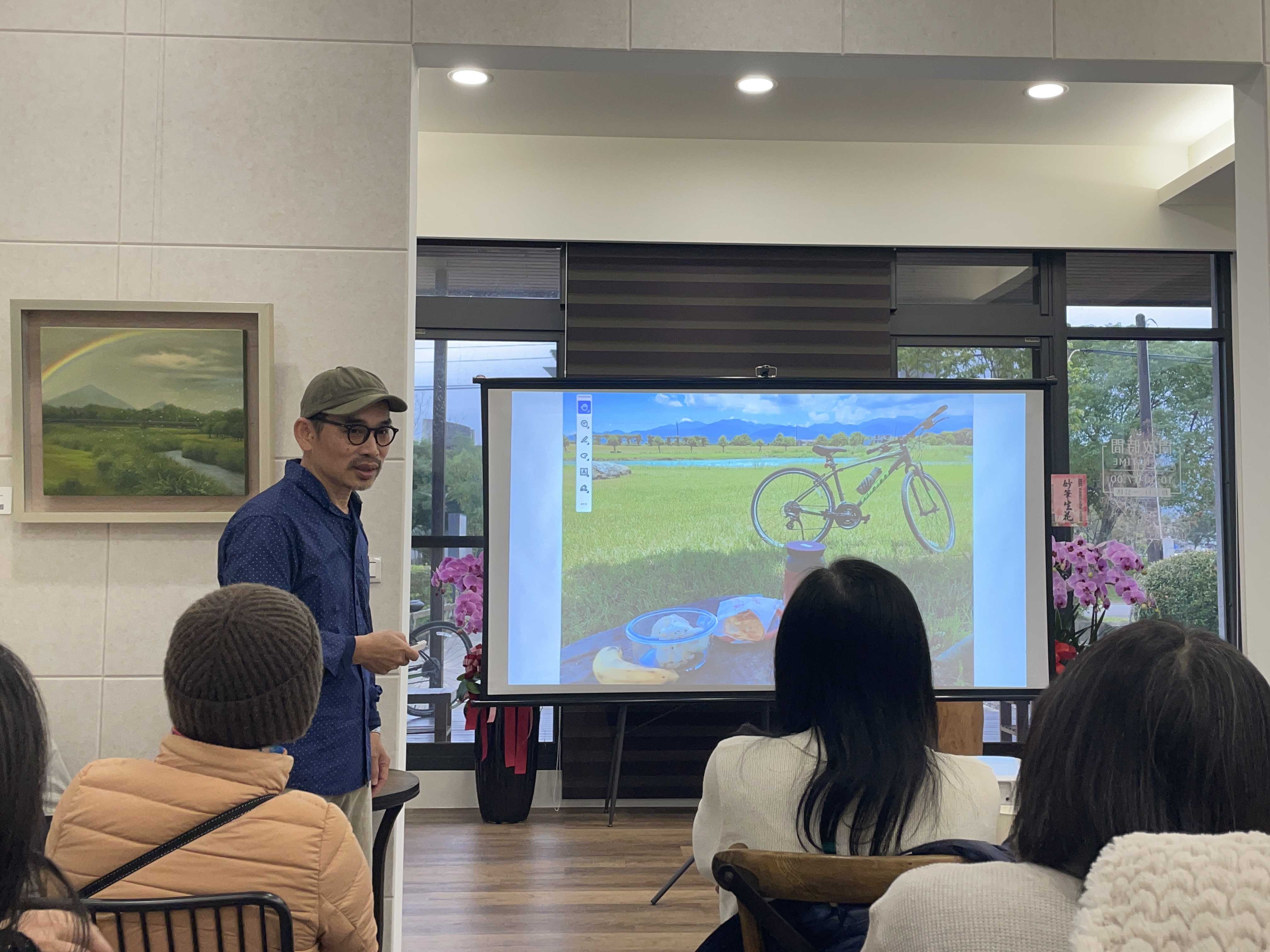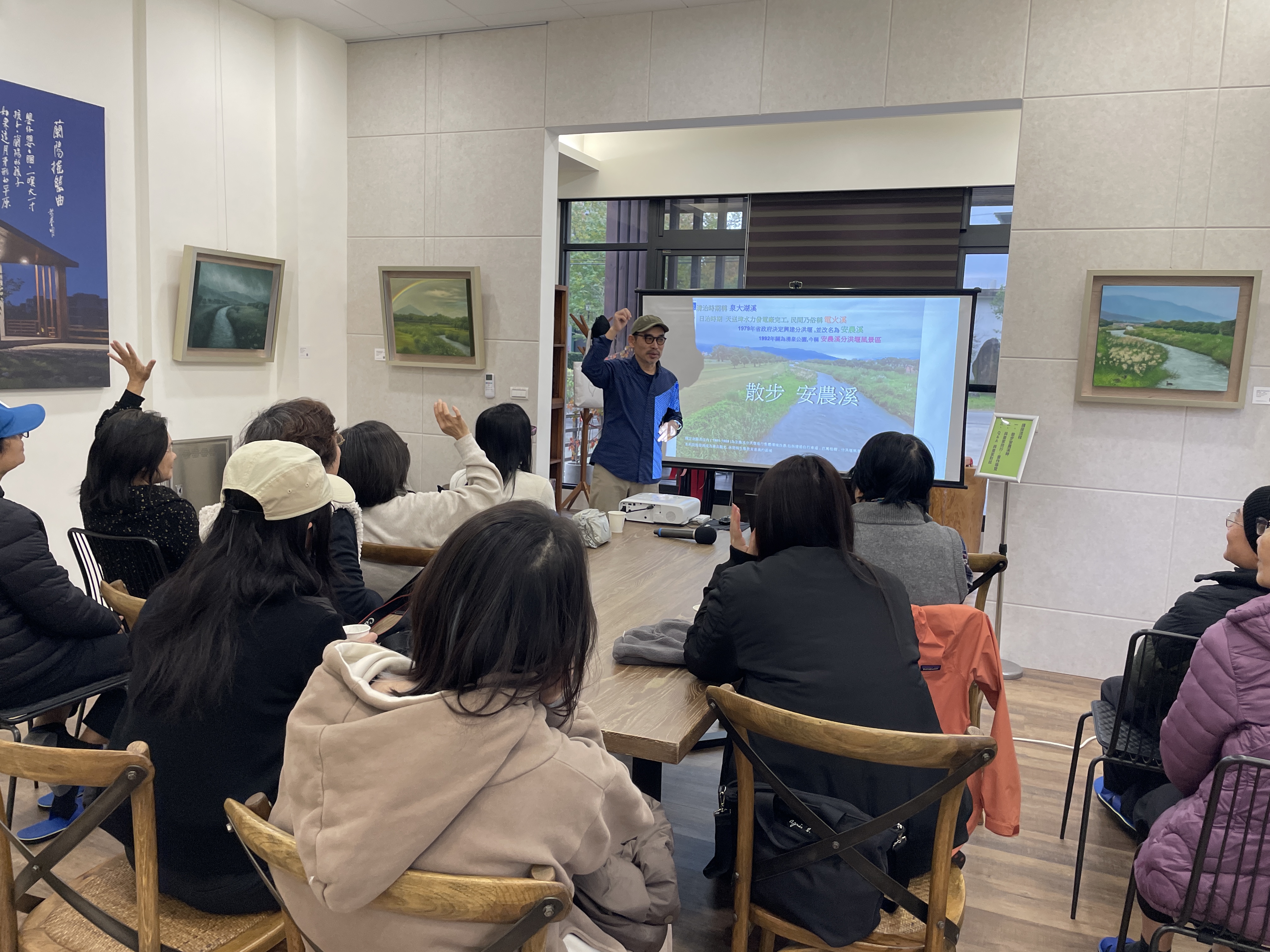 講座從「散步安農溪畔」開始,藝術家張堂龲老師騎著單車帶領著大家漫漫散步安農溪,老師細細說著安農溪的歷史、樣貌、生態:走上情人橋遙想著橋墩原先有著抿石子的素雅外觀卻在十年前漆上了粉紅色;溪水兩側的甜根子草又或者芒草抑是蘆葦叢中能發現花嘴鴨,鴨群在沙洲穿梭其間生活的蹤跡,原來是牠們的棲息地;走著走著停在安農溪畔苦楝花樹下聞著淡淡花香,在分洪堰欣賞龜山島的夕陽時分,在情人橋上驚見新年的第一道曙光….。