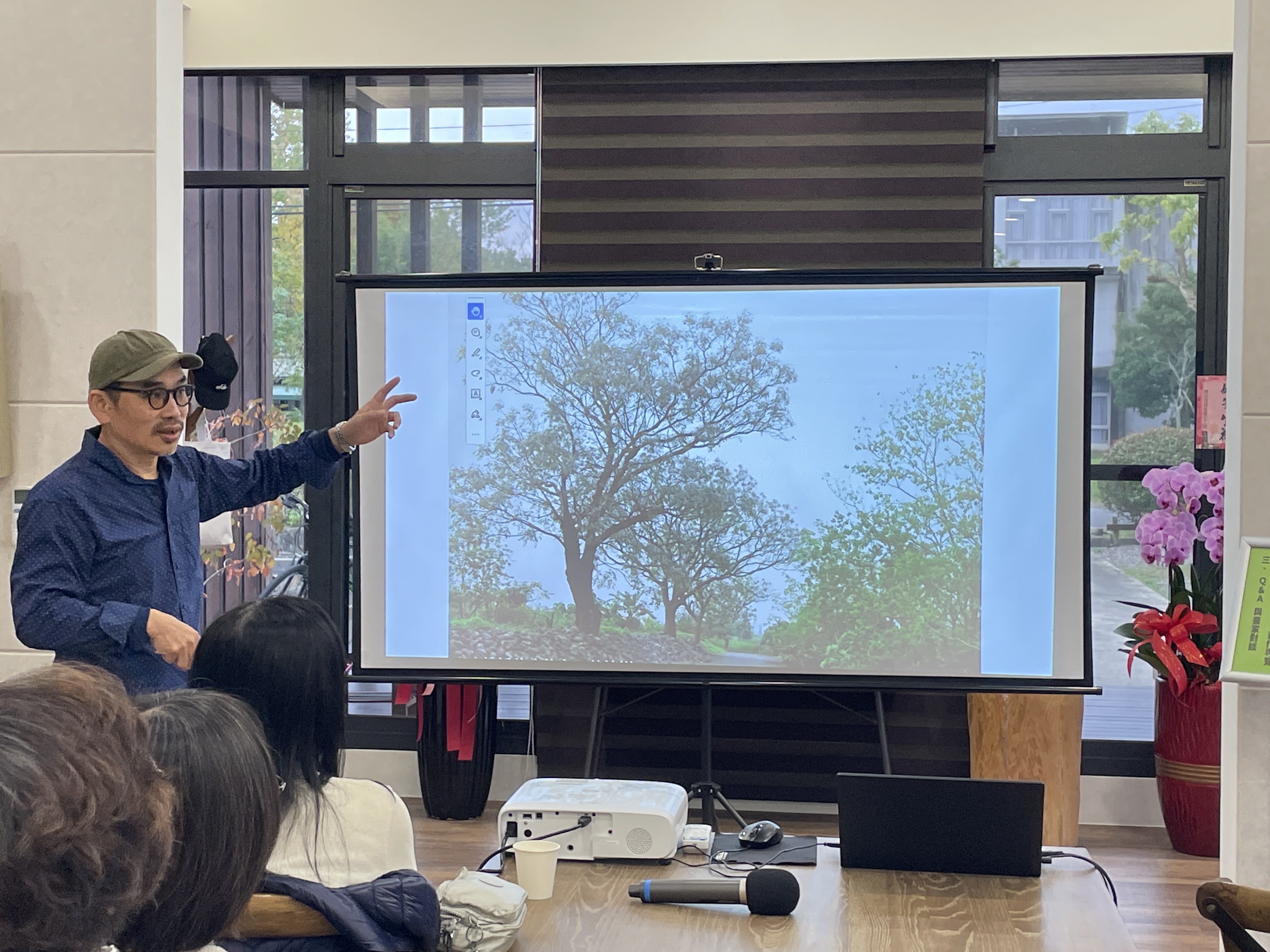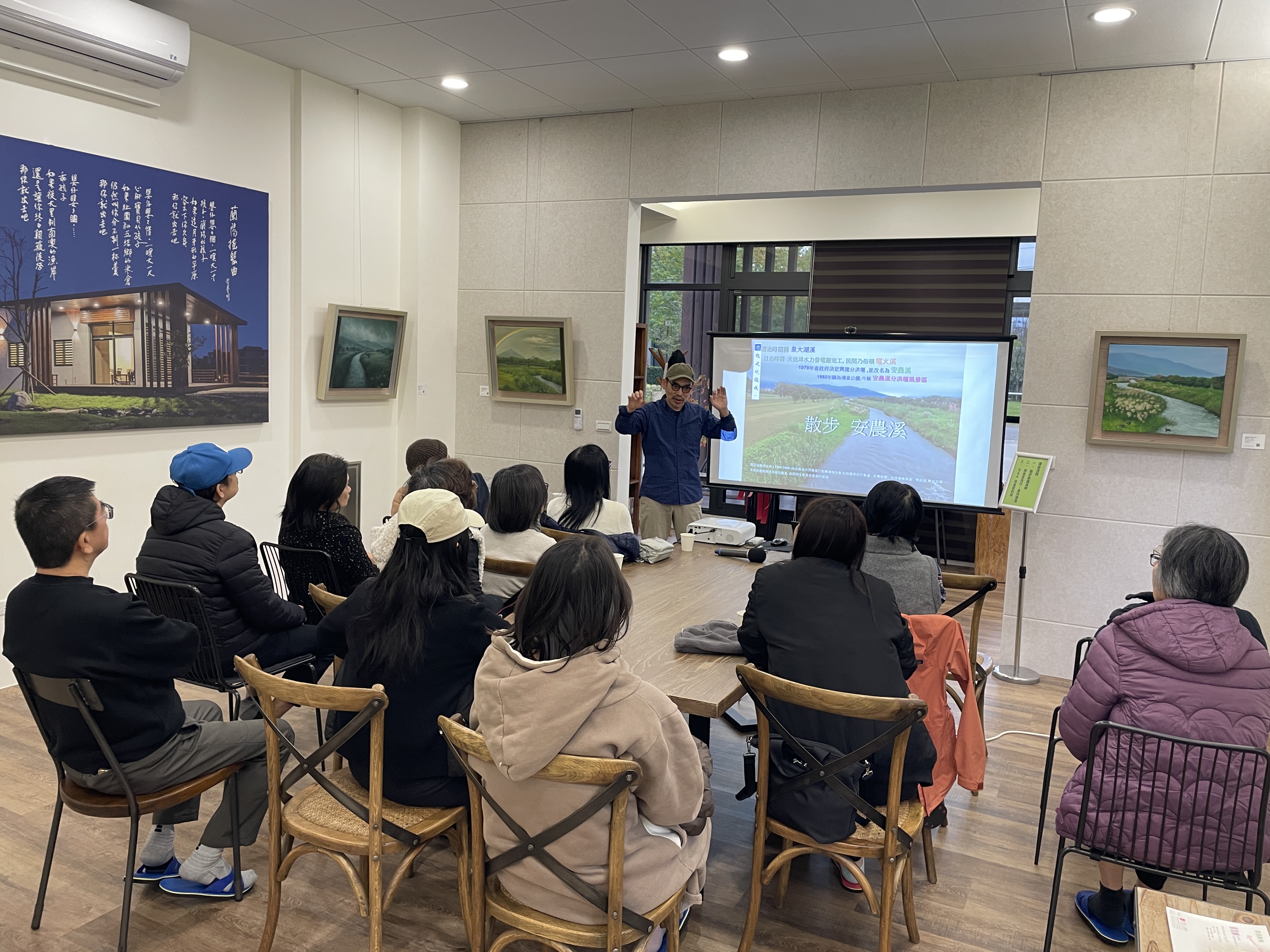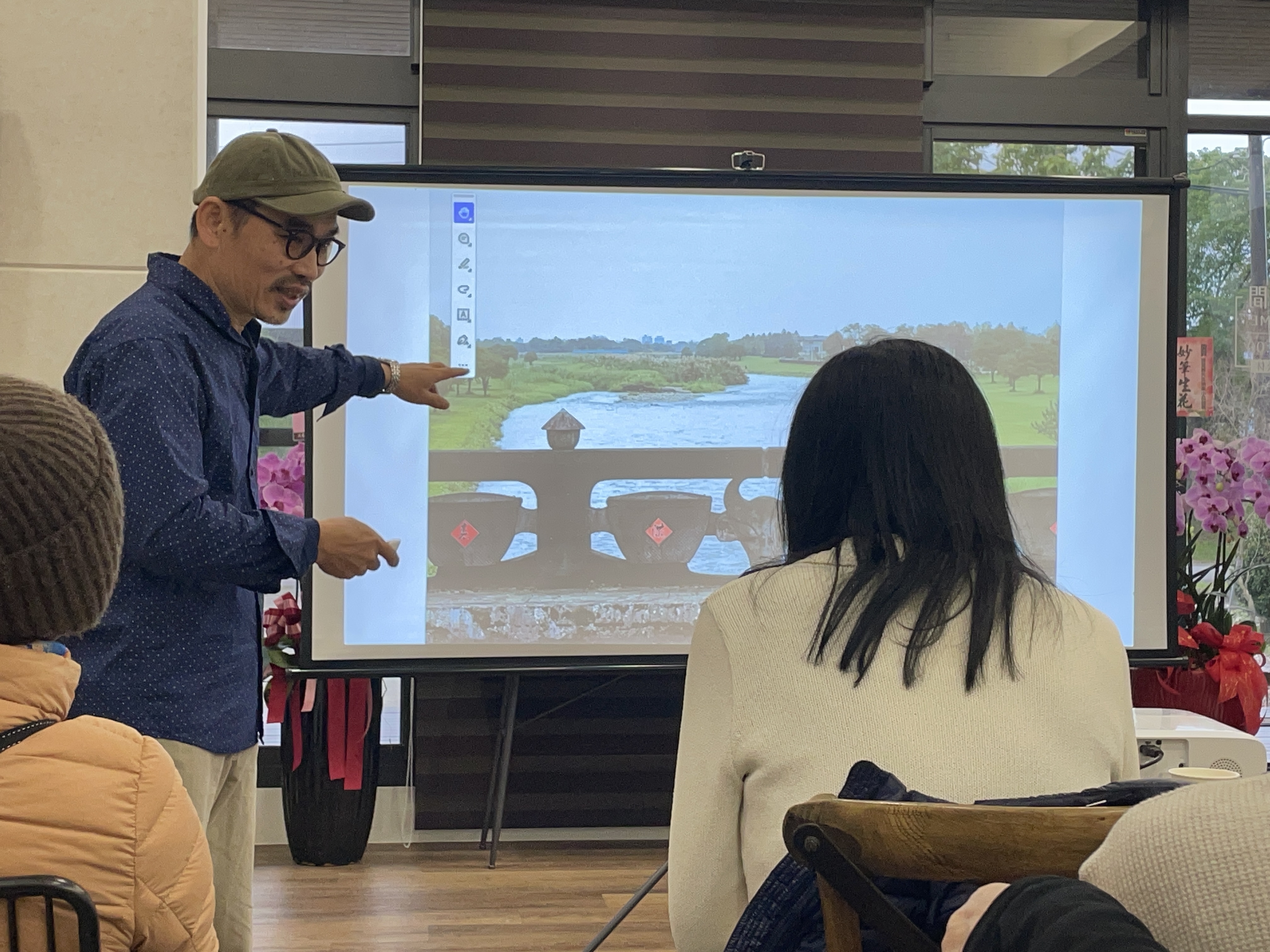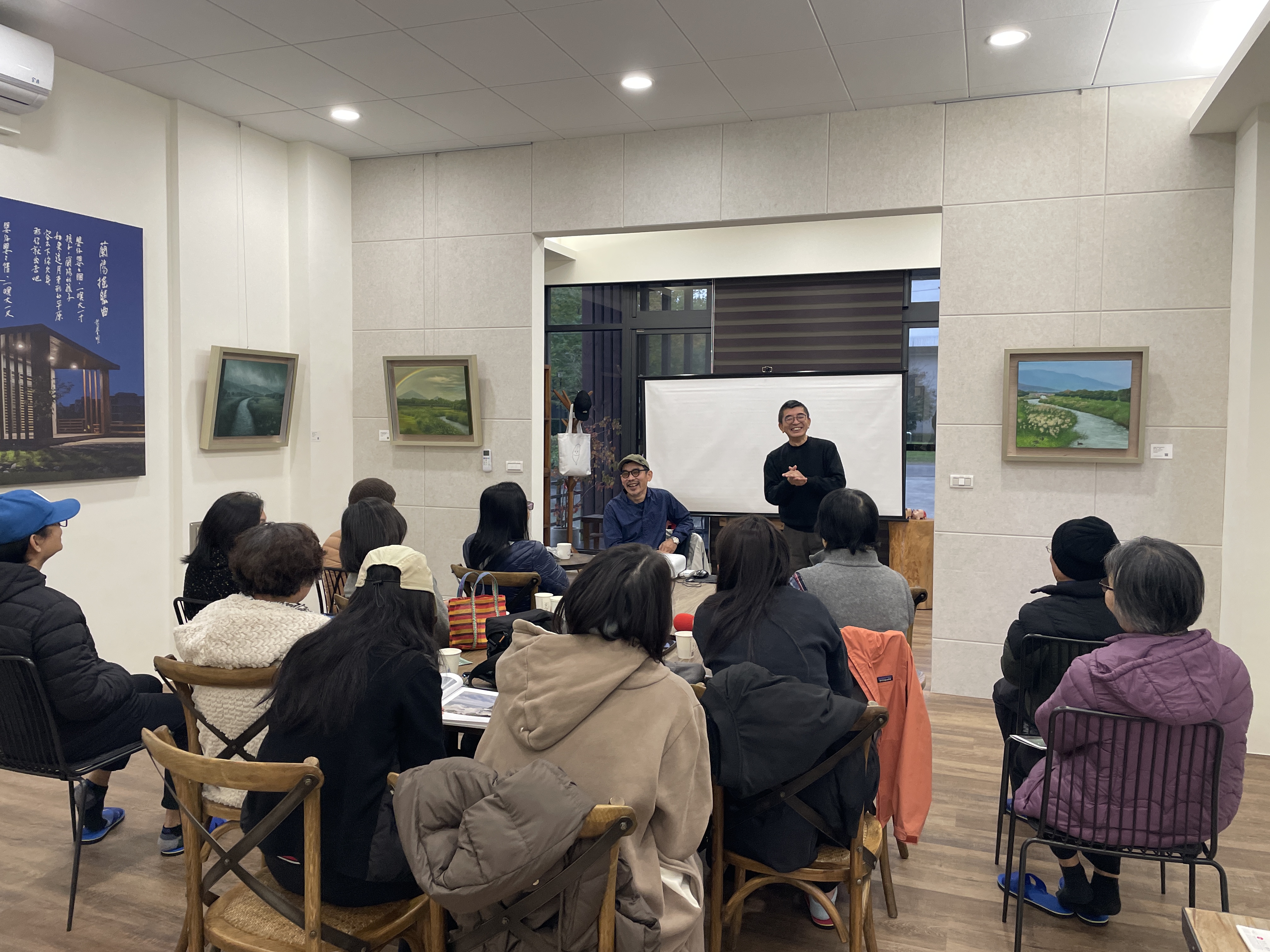 講座從「散步安農溪畔」開始,藝術家張堂龲老師騎著單車帶領著大家漫漫散步安農溪,老師細細說著安農溪的歷史、樣貌、生態:走上情人橋遙想著橋墩原先有著抿石子的素雅外觀卻在十年前漆上了粉紅色;溪水兩側的甜根子草又或者芒草抑是蘆葦叢中能發現花嘴鴨,鴨群在沙洲穿梭其間生活的蹤跡,原來是牠們的棲息地;走著走著停在安農溪畔苦楝花樹下聞著淡淡花香,在分洪堰欣賞龜山島的夕陽時分,在情人橋上驚見新年的第一道曙光….。