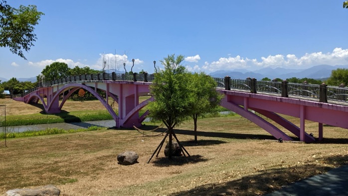 安農溪分洪堰風景區:安農溪的水源相當豐沛,是超大的一片綠地,有欒樹、茄苳、落雨松等樹木,整個風景區相當舒服,不管是來這裡散步或騎腳踏車都超適合!分洪堰醒目的地標【分洪橋】特別漆上粉紅色變身【粉紅橋】,是三星七夕情人節的情人鵲橋。這天天氣很好,分洪堰景色怎麼拍都很好看。