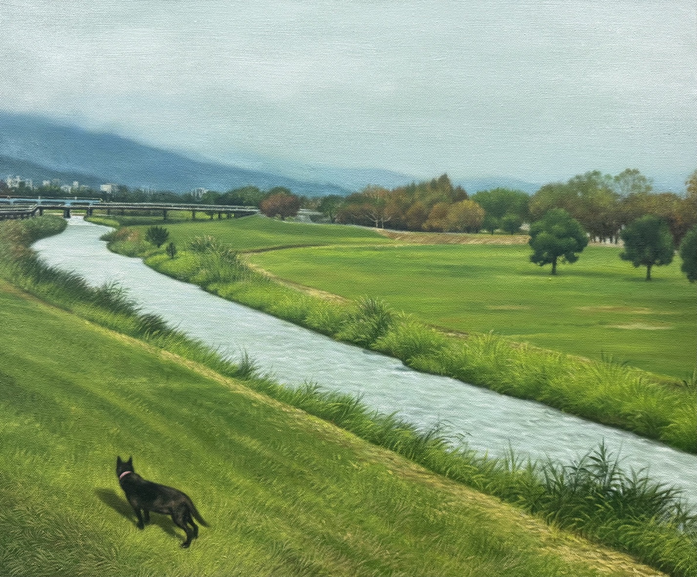 這幅畫承載的不只是風景,而是記憶的痕跡。黑犬的身影化作自然的一部分,與秋野的色彩、霧氣的輕柔交織。牠的存在,如同回聲般隱約卻真切,提醒我:思念不是缺席,而是一種延續。