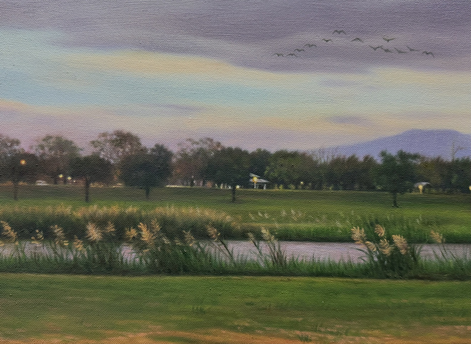 此時,天空中有一排飛雁,方向一致地以人字型的隊列飛過灰紫色的暮雲,雁兒們彷彿在用振翅飛行默默書寫著歸途的詩篇。牠們是否也在遙遠的歸鄉路上呢?我喜歡這樣的提問,不一定要有答案,只要能喚起觀者心中的某種共鳴。