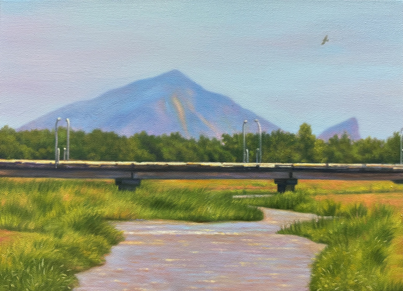 溪流靜靜地流淌,大洲橋的身影橫跨其上,人與自然的節奏在此交會。蘆葦在兩岸迎風搖曳,像是晨光中的低語,也像是陪伴孤鷹飛行的節奏。整體色調鮮明而不喧嘩,像是一首在曦光中緩緩展開的詩。