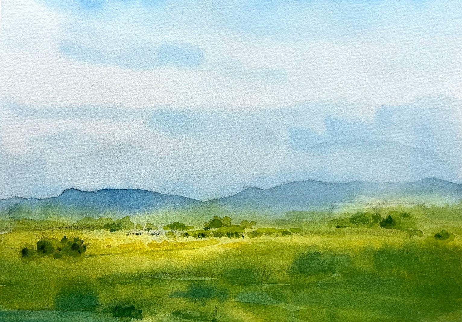 如果我是一隻鳥,我會先在那片翠綠的稻浪上低空掠過,感受一下水彩渲染出的那種濕潤與涼意。