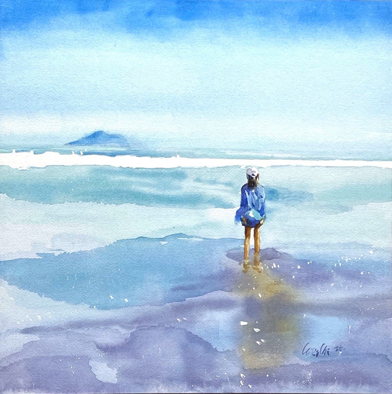 一位女孩獨自赤著腳,踩在沙灘上,若有所思看著遠方的龜山島,雙手微微拉高短褲,像是擔心弄濕了衣服。