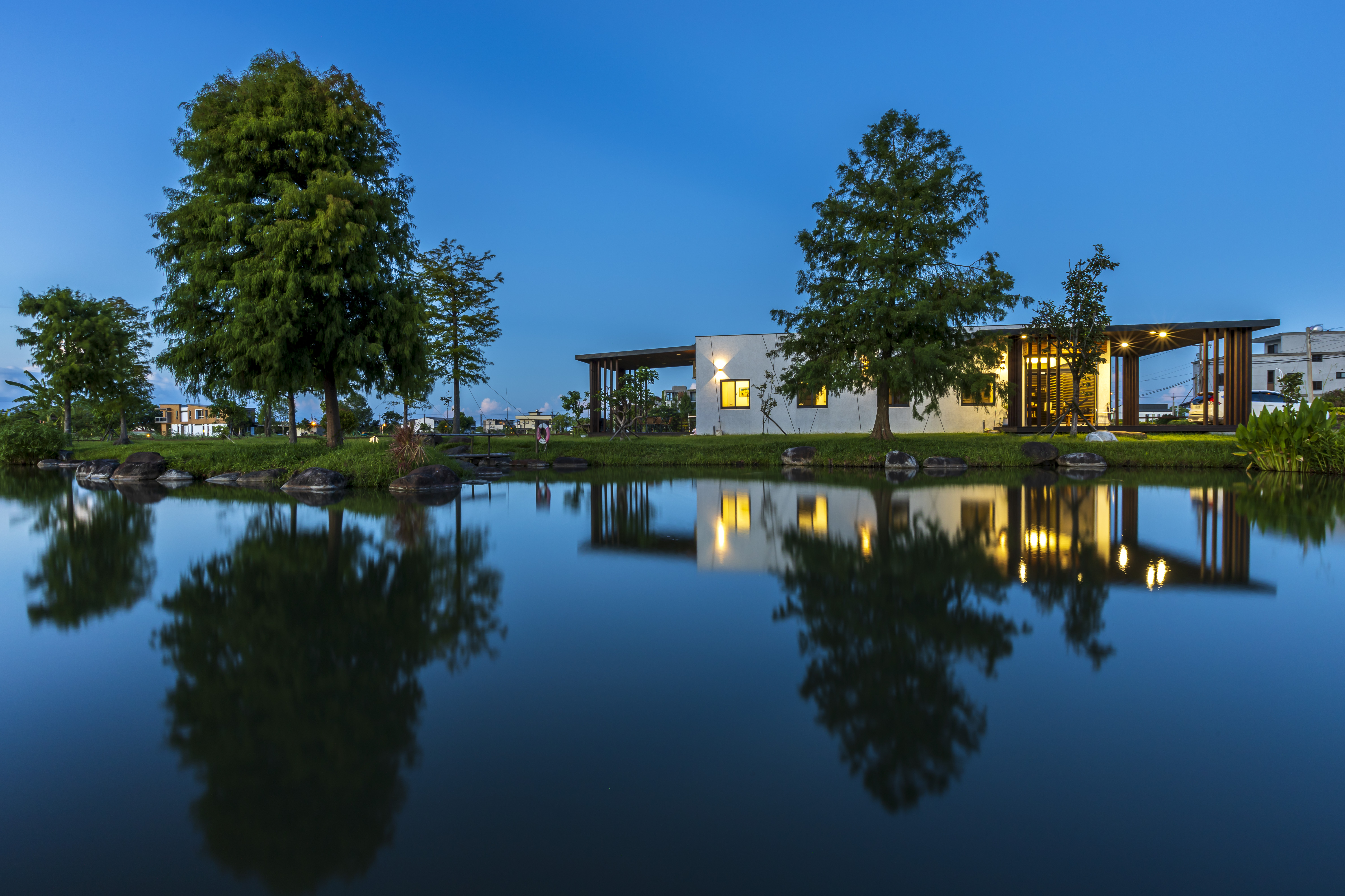 傍晚時分園區建築物壁燈微亮,樹影及建物燈光倒映在寧靜水塘上,園區時不時傳來陣陣低吟的蛙聲與蟲鳴合奏的鄉村月夜交響曲,這是多麼的美妙動人鄉村景色。