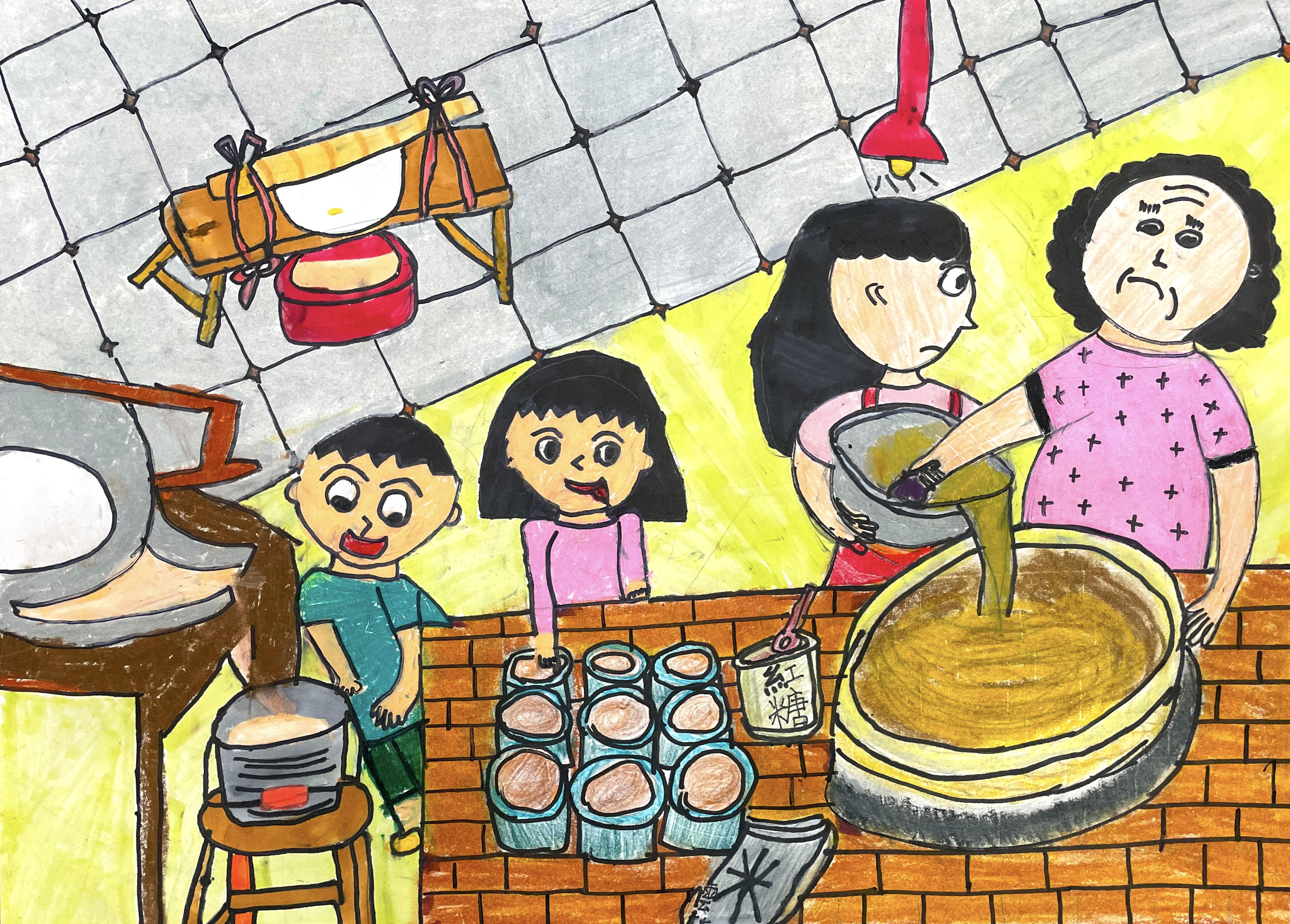 畫作說明:外婆帶著我們一起做年糕,是愛的傳承。