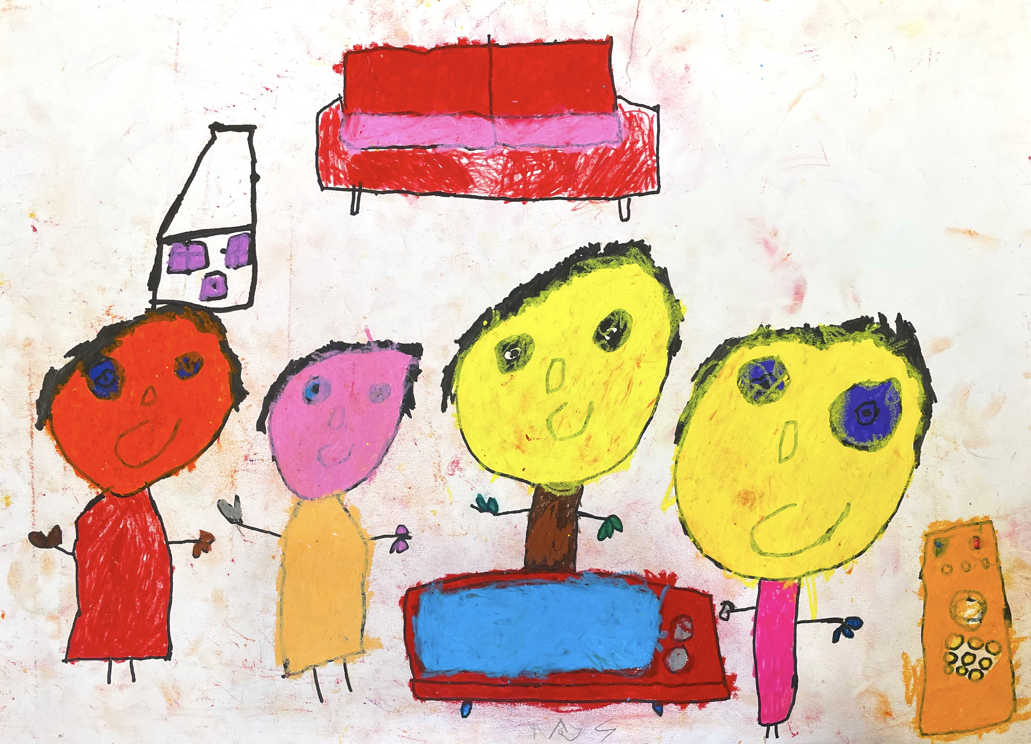 「我們家在客廳看電視」描寫了全家一起享受家庭時光的場景,仔細畫了人物與客廳的各項設備,清新可喜,賞心悅目。