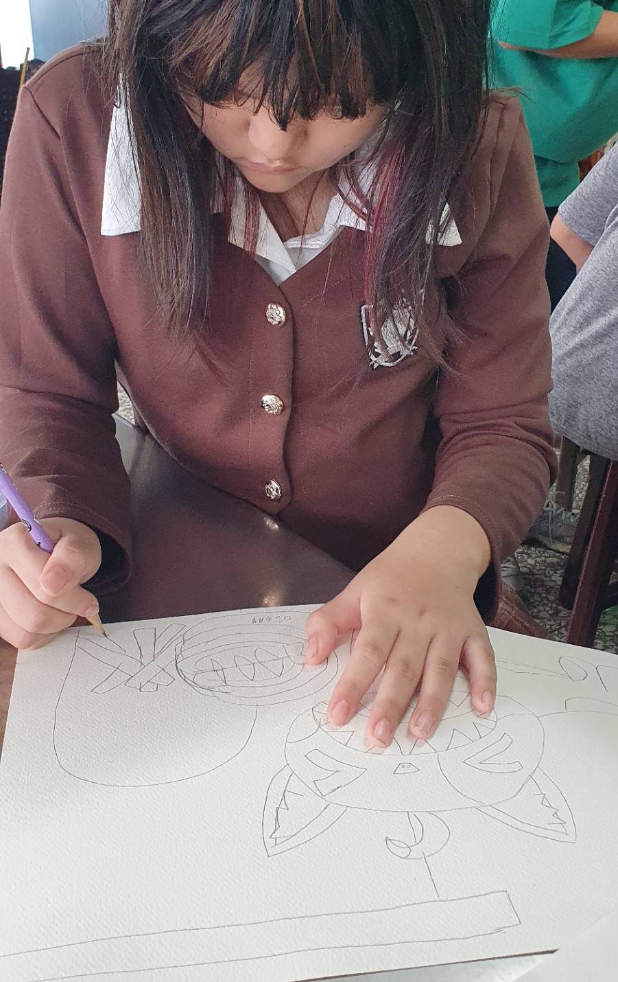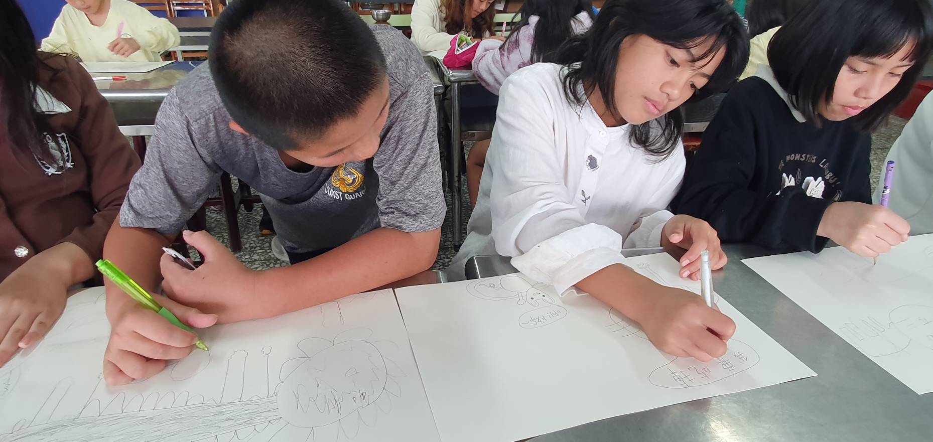 十分鐘過後,球鞋上伴隨著泥土、黏著小草再次回到教室,繼續聽著哈娜的故事,拿著鉛筆奮力的將自己腦袋裡的哈娜,投映在八開畫紙中,把想對花貓哈娜的話留在明信片上。