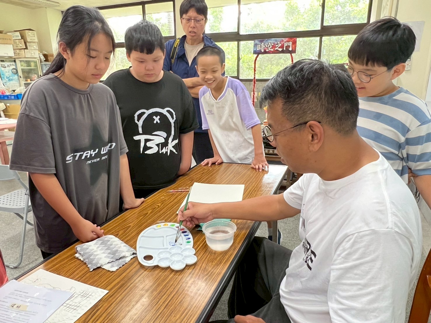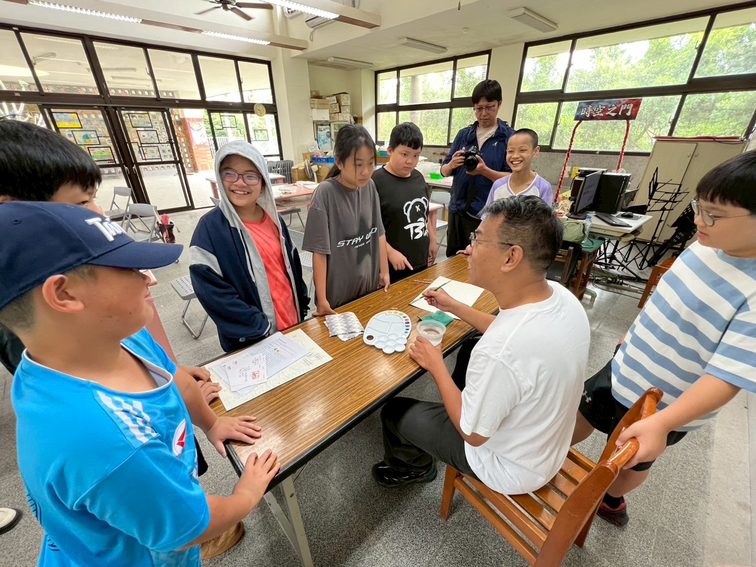 ✍️寫明信片時,孩子們邊寫邊問字怎麼寫,後來乾脆跑來團團圍在老師旁邊寫。