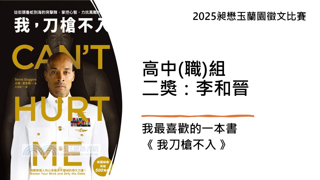 何謂我最喜歡的一本書?我喜歡用著故事帶出深沉道理的書籍,其中以自身經驗為例,更能使我感興趣。市面上有各式書籍,但我為何獨鍾倫理的主題,而非像同齡人一樣沉浸小說或著動漫,這或許是深受家庭環境影響。我的雙親從我小時就培養我獨立思考能力,所以我被冠上「問題兒童」這個稱號,但這並非是頑皮之意而是我喜歡「問問題」,我期待了解這事上的總總事物及真理,高中時我在導師的引導下發現了名為書籍的寶藏,身小我便沒有養成閱讀習慣,總是無法冷靜下來專心地讀一本書,直到遇見了他我的處女書籍「蔡康永的說話知道」,這是我第一本專心看完的書,也是我人生中第一本的說話書。我總喜歡在閱讀時詢問自己是否有過這樣的經驗並且把書中的道理技巧套用在生活中,因為喜歡探求真理所以我想更認識自己,透過不斷地接觸各類書籍,直到我遇見了影響我最深的一本「我刀槍不入」,這本書是我在逛誠品時無意發現的,它是我頭一次見到封面如此莊嚴、顯眼的書,他的封面是名叫哥金斯的士官長,有著乾淨俐落頭頂的嚴肅男人,在他的背後則是一個若如影子般的豐腴男人,當下的我並未對內容產生絲毫興趣。直到滑短影音時無意間看到有人推薦「我刀槍不入」,他闡述著「此書為大衛哥金斯真人真事改編,講述著一名男人在追夢的過程中經歷了許多低潮,在讀小學時,卻已和哥哥、媽媽變成爸爸的魁儡,童年陪伴他的印記就是滿滿的瘀青及傷痕,小學時因受教不足及膚色受到同儕的排擠,上了高中更是加入幫派過著混吃等死的日子。之後的他每遇到使他挫折的事都能以他過人的意志力及耐錯力在困境中照出一絲的希望。」他的遭遇使我感到震驚,我好奇著他童年的噩夢、好奇著他解決問題的方法,但最令我好奇的是他為何能得到地表「最強男人」的稱號。