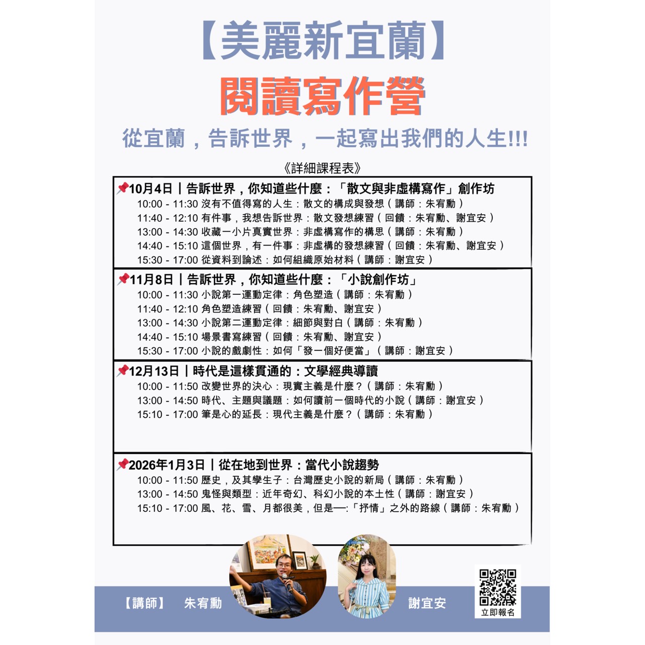 他們倆位即將專程到宜蘭先後主持四場文學創作坊及文學導讀活動,機會難得,名額有限,歡迎大家立即報名。