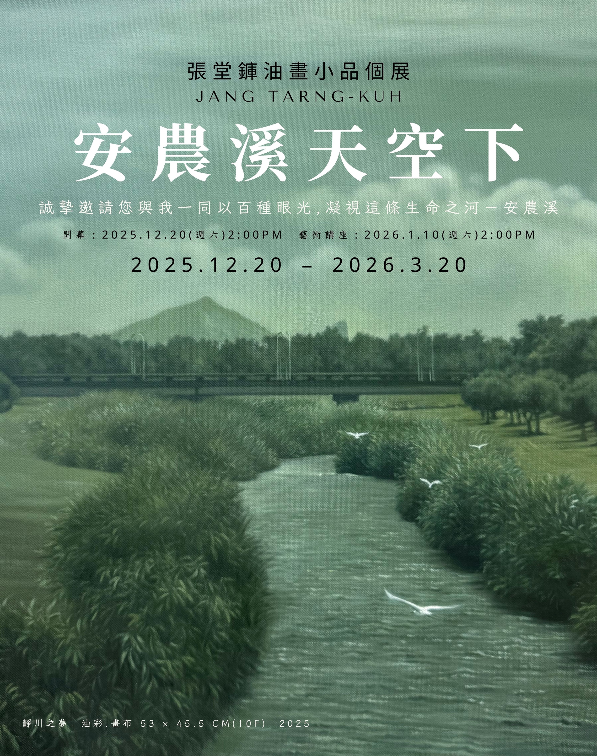 安農溪不以壯闊取勝,卻以細膩的風情、四季與光影變幻流轉,成為我創作的靈感泉源。此次個展《安農溪天空下》,展出十餘幅十號以下的小品油畫,期望以小幅畫面凝聚自然的深情與詩意,邀請觀者一同走入這條溪流的靜謐世界。