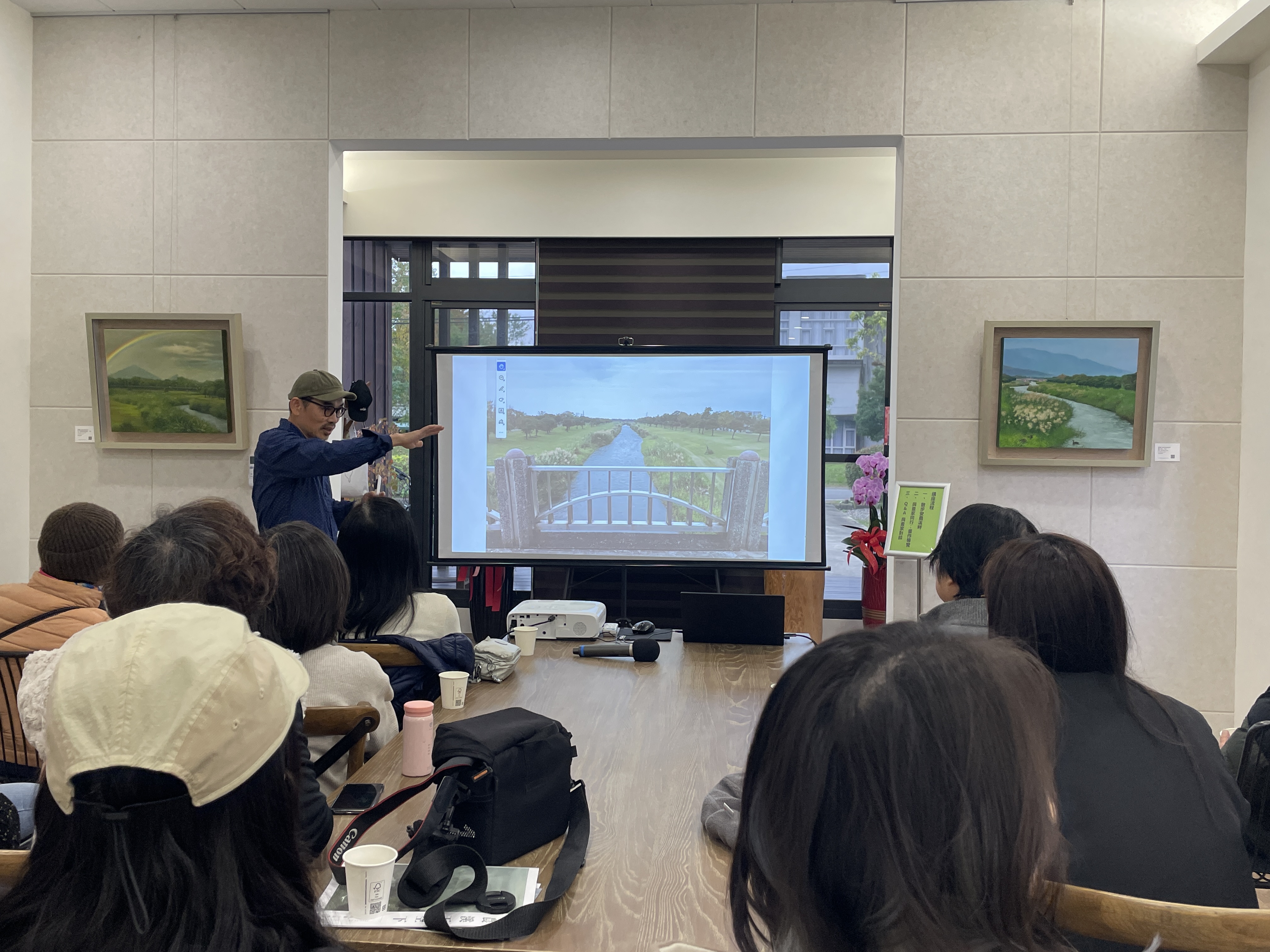 講座從「散步安農溪畔」開始,藝術家張堂龲老師騎著單車帶領著大家漫漫散步安農溪,老師細細說著安農溪的歷史、樣貌、生態:走上情人橋遙想著橋墩原先有著抿石子的素雅外觀卻在十年前漆上了粉紅色;溪水兩側的甜根子草又或者芒草抑是蘆葦叢中能發現花嘴鴨,鴨群在沙洲穿梭其間生活的蹤跡,原來是牠們的棲息地;走著走著停在安農溪畔苦楝花樹下聞著淡淡花香,在分洪堰欣賞龜山島的夕陽時分,在情人橋上驚見新年的第一道曙光….。