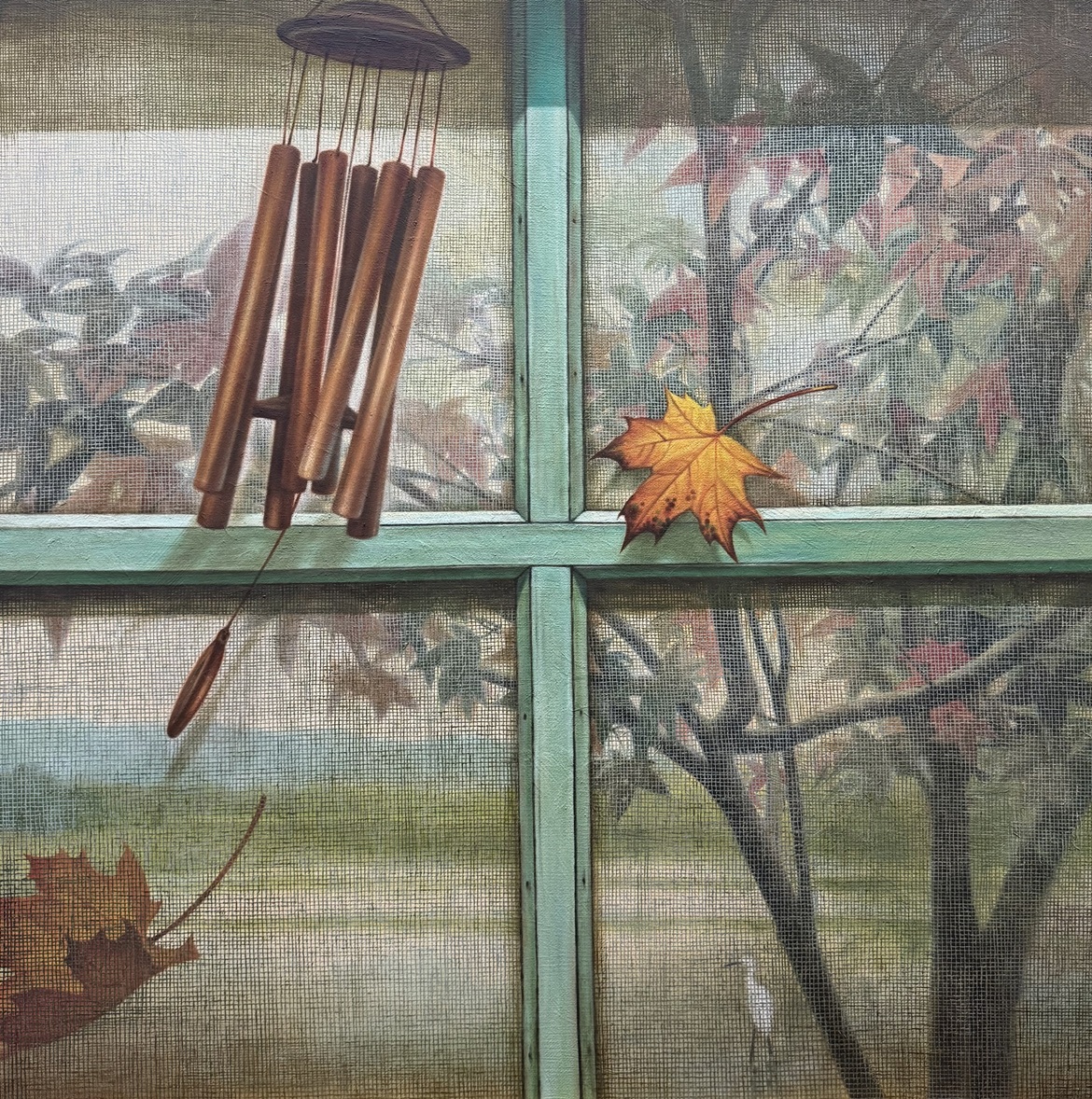 這幅作品源自「紗窗系列」,我選取舊式紗窗的中心片段作為構圖。紗窗既是隔絕,也是通透,它在室內與室外之間形成一種微妙的界限。透過這個界限,我凝視著蘭陽平原入秋後的景象:休耕的水田化為一片靜謐的水面,映照著天空的光影;樹上的楓葉逐漸轉紅,秋風掠過,葉片隨風飄落。