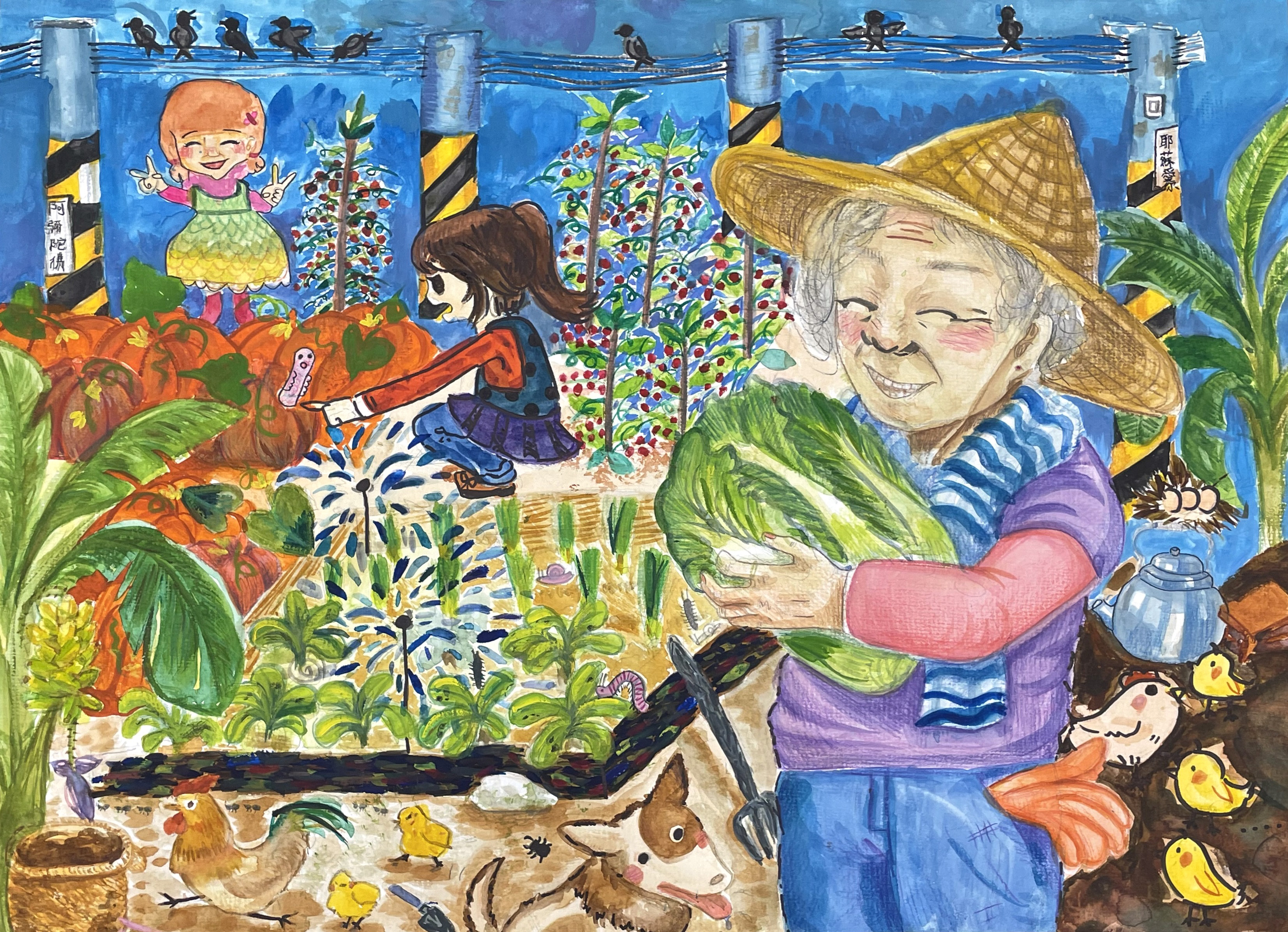 評審評語:以小女孩陪阿嬤種菜為主題,阿嬤手抱包心白菜,露出溫暖的笑容,和女孩們的笑容以及蹲姿相互呼應。菜園的雞隻和狗,也增添作品的說服力。
