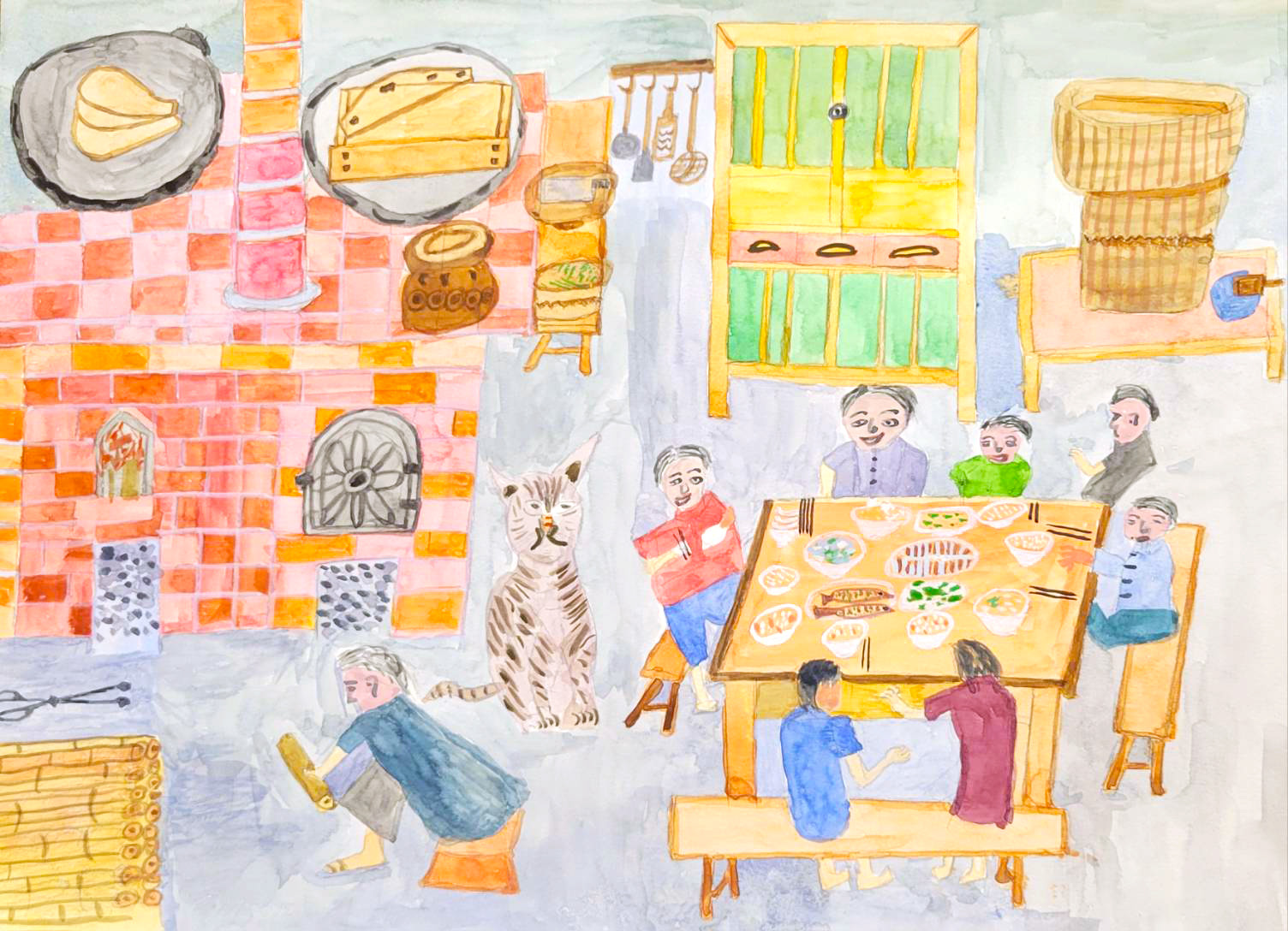 畫中人物及物件擺設描寫考究寫實之外,在色彩的運用上也用盡心思,整體畫面配色儘管豐富,但是卻也乾淨清爽,尤其是用深淺不一的朱紅色系相互交錯表現的大灶,不僅提升飽和度,也讓畫面呈現出溫暖、活潑又熱鬧的趣味。