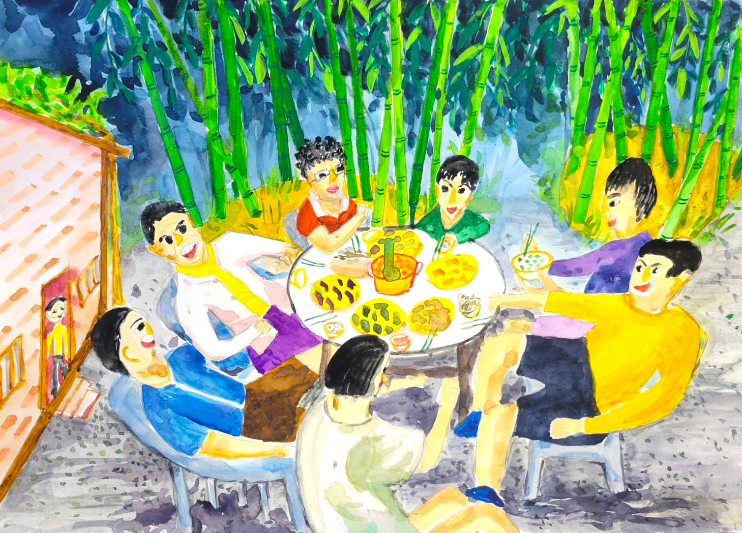 畫作說明:古厝竹圍下,家族聚會好時光。
