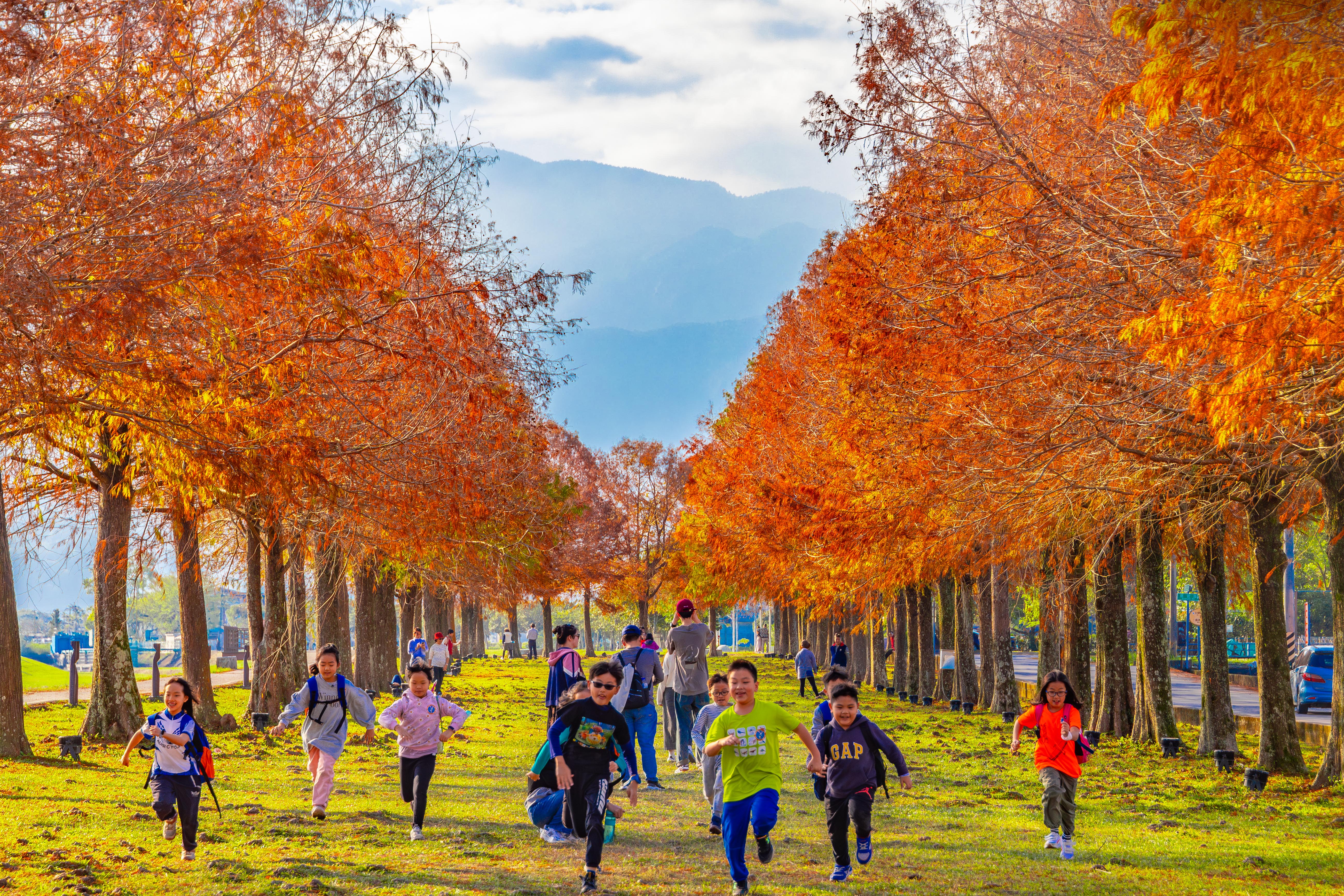 林宜靜:安農溪落雨松已經成為台灣知名景點,攝影者捕捉到冬季落羽松葉子轉紅,一群孩童奔跑期間的模樣。遊客與大自然情景交融,美好又欣喜。