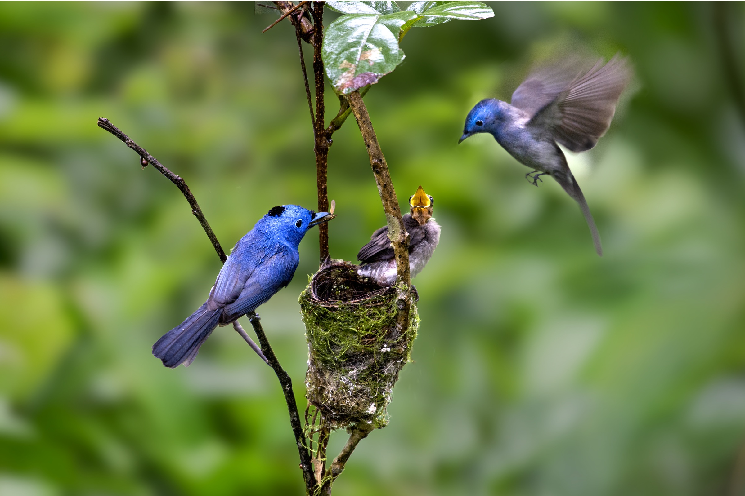 在一片繁茂的森林中,一隻鮮藍的鳥展翅飛向巢穴,巢中幼鳥張嘴等待餵食,另一隻鳥立於樹枝上守護,展現親鳥無微不至的呵護與自然的溫馨畫面。