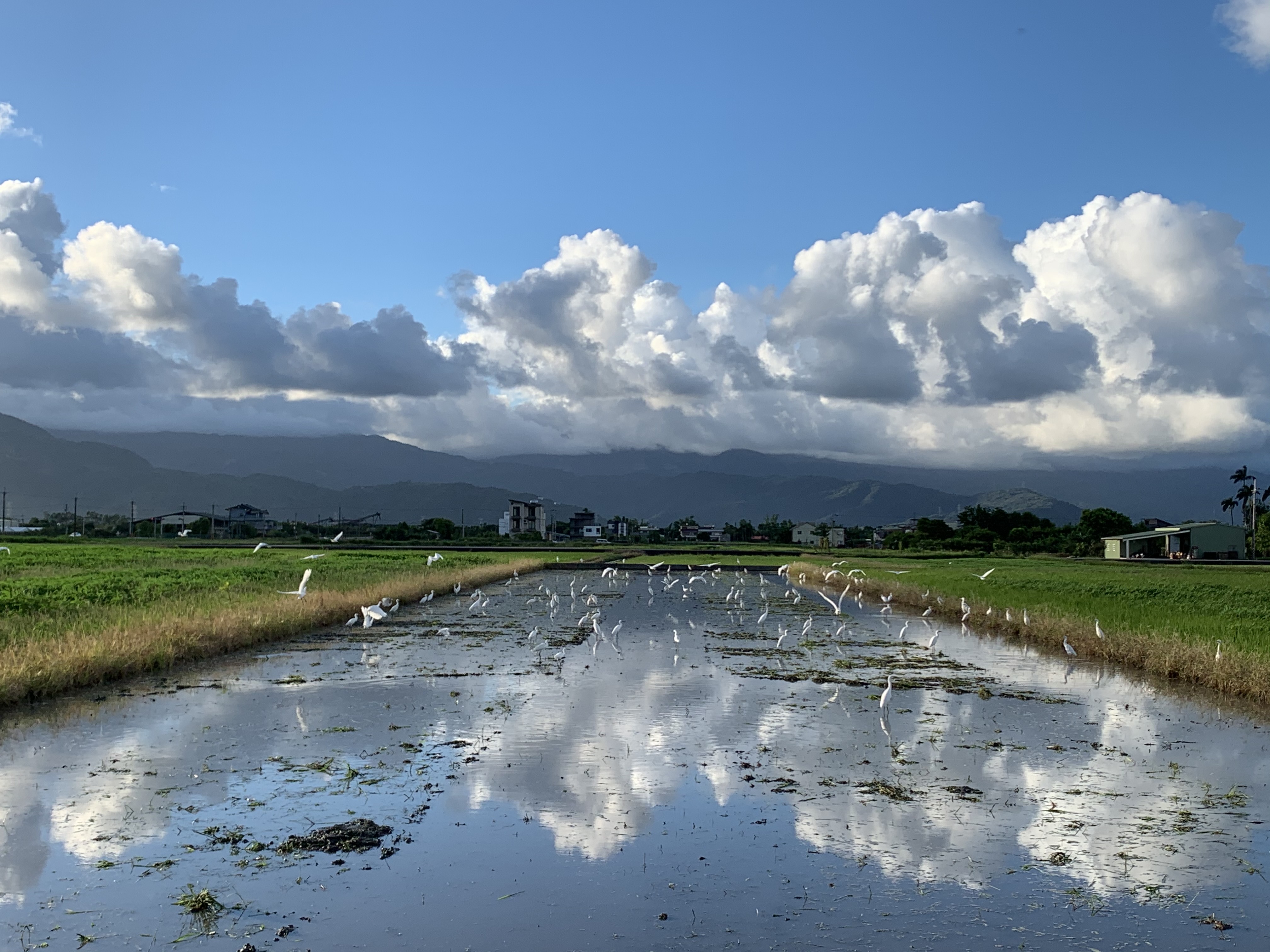 夏日稻禾收割後,田地映著雨水,襯出藍藍的天空和白雲,恰巧成了白鷺鷥的舞台,在炎熱的午後翩翩起舞。