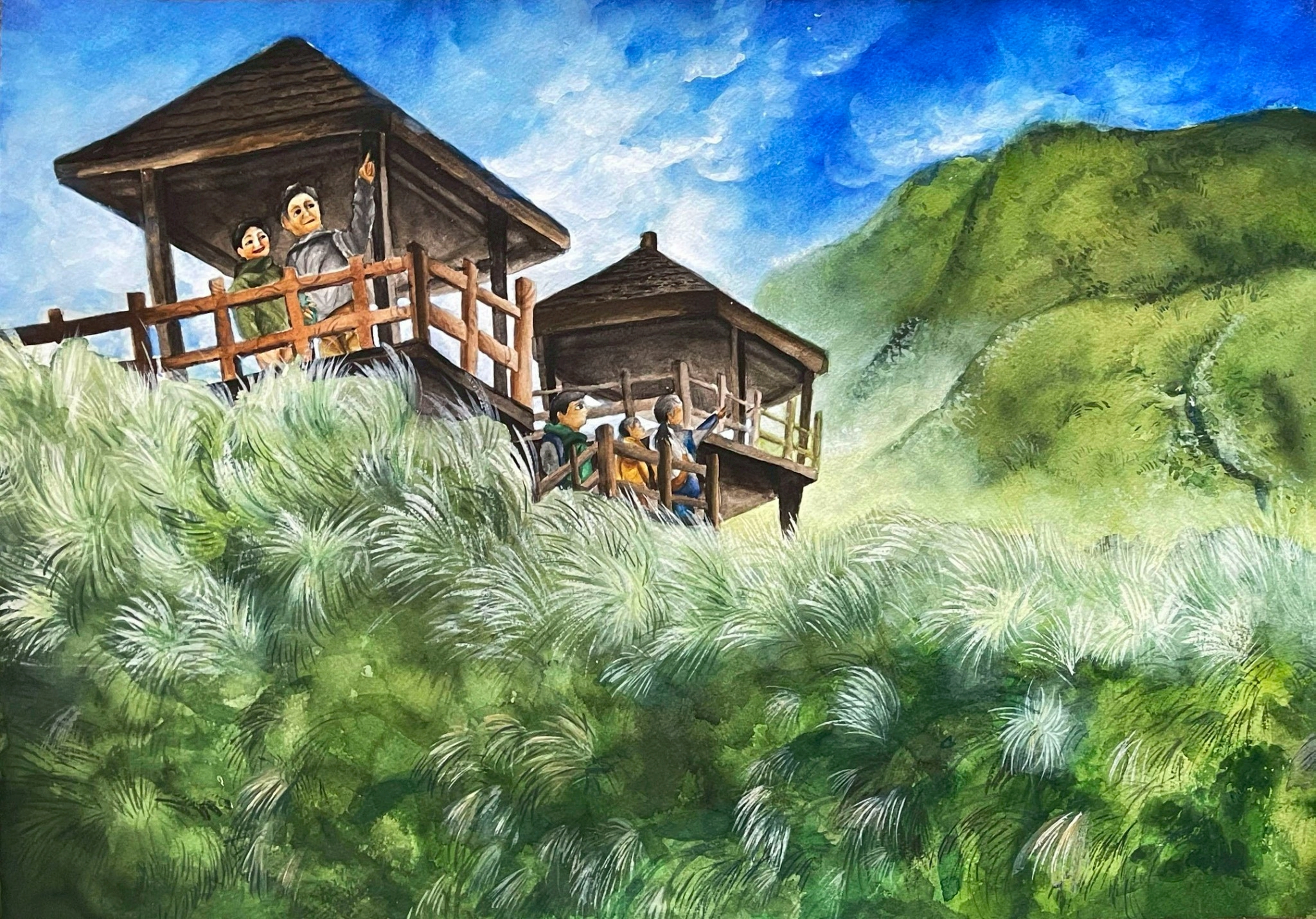 張堂龲評審:草嶺古道是早期先民往返台北與宜蘭間的要道,同時也是淡蘭古道的其中一段,作者畫中描寫的場景應該是啞口觀景亭附近,每到芒草季節就會吸印大批遊客前來。