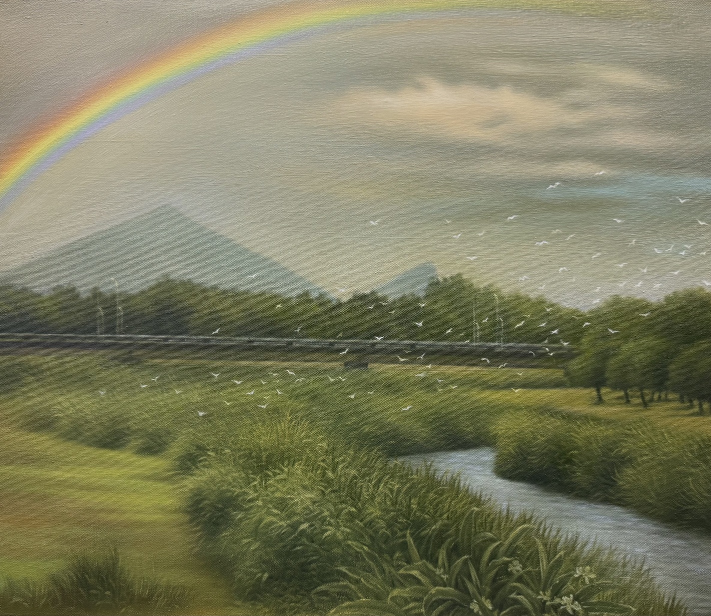 就在此刻,一道彩虹悄然升起,橫跨天際。色彩柔和而細緻,彷彿天空輕輕描繪的一筆,將雨後的光與水凝結成詩。溪畔的白鷺群突然振翅而起,可能因驚擾而成群飛離,從這一岸掠向彼岸的草地。牠們的身影如白蝶般輕盈,在空氣中劃出生命的律動,為靜謐的畫面注入一絲動感與生息。這短暫的飛翔,正如彩虹的出現——美麗卻稍縱即逝。